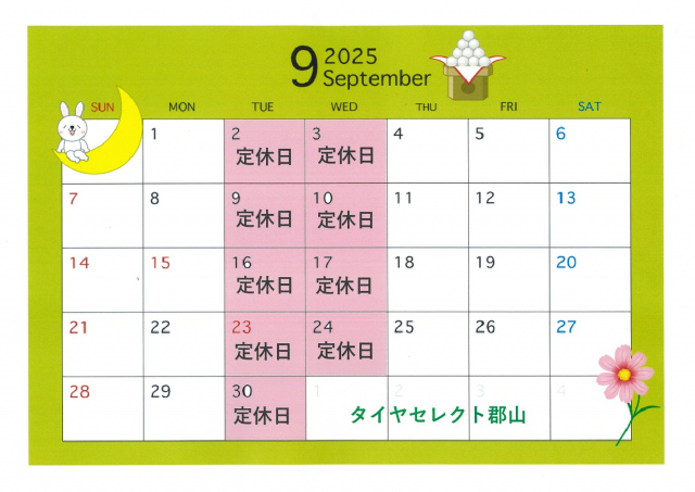 みなさん、こんにちは(^^)/ 連休はどのように過ごしましたか? 私は、カフェに行ったり飲みに行ったり、BBQをしたり、花火を見たりと 夏らしいことを満喫できました(^^♪ 9月定休日のお知らせです 毎週火・水曜日...