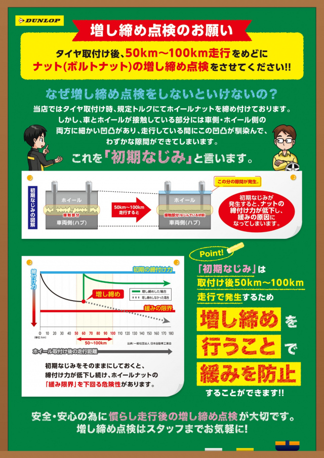タイヤ交換シーズン真っ只中ですが、タイヤ交換された方は増し締め点検はお済ですか? 当店での取り付けの際はトルクレンチを使用し、規定トルクでの締め付けを行っておりますが、ホイールと車両側が馴染んでくると緩...