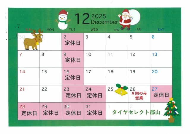 こんにちは~(^^)/ みなさん、タイヤ交換はおこないましたか?本格的な冬が来る前に 早めに交換をしましょう!まだまだタイヤ交換の予約受付しておりますので、 ご予約お待ちしております!! 12月定休日のお知らせ...
