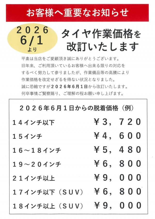 2026年6月よりタイヤ作業料の価格改定をおこないます。 詳しくはスタッフにお尋ねください。 皆様にはご迷惑をおかけしますが、ご理解とご協力の程よろしくお願いいたします。
