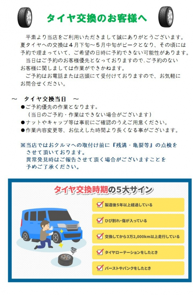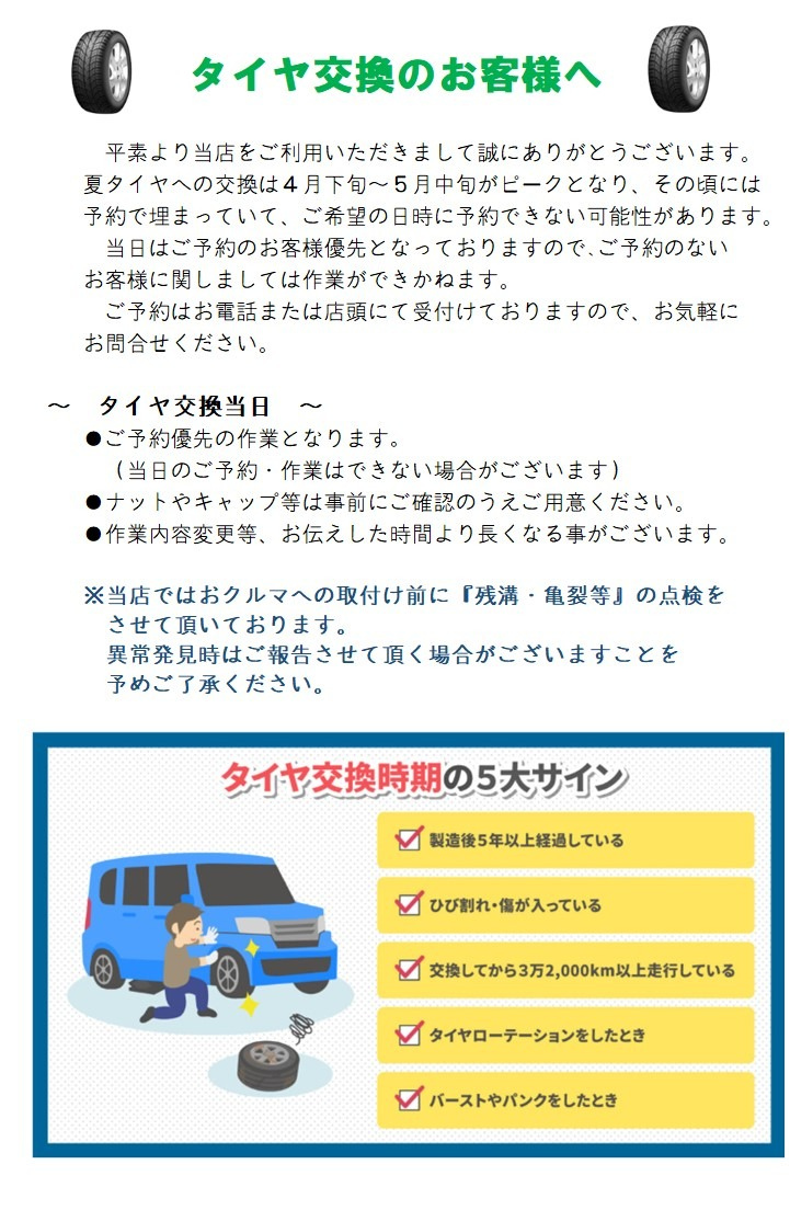 夏タイヤ交換のお客様へ / 定休日のお知らせ