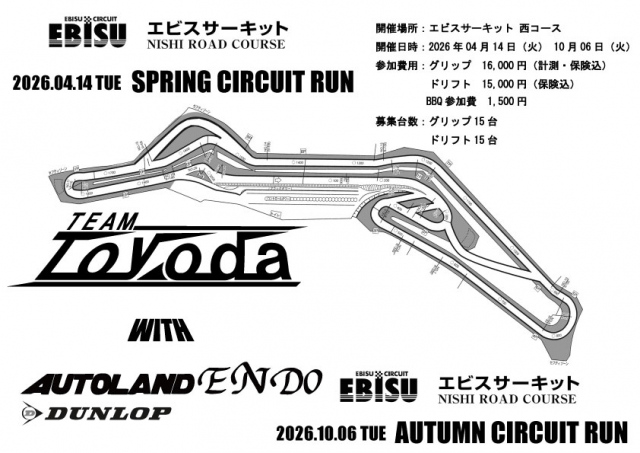 2026年 今年は、春と秋の2回開催です。(エビスサーキット4月:10月共西コース) 今回もTEAM TOYODAと合同開催になります。 画像をクリックすると申込用紙がダウンロード出来ます。 また、店頭にもご用意しておりま...