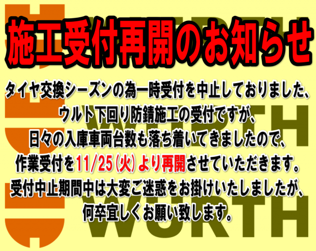 こんにちは、なかみちです。 本日は先月から受付を中止しておりました、 ウルト下回り防錆施工の受付再開をお知らせいたします。 本格的な冬シーズン突入前に、 大切なお車を塩害から守りませんか? ちなみに、私の愛...