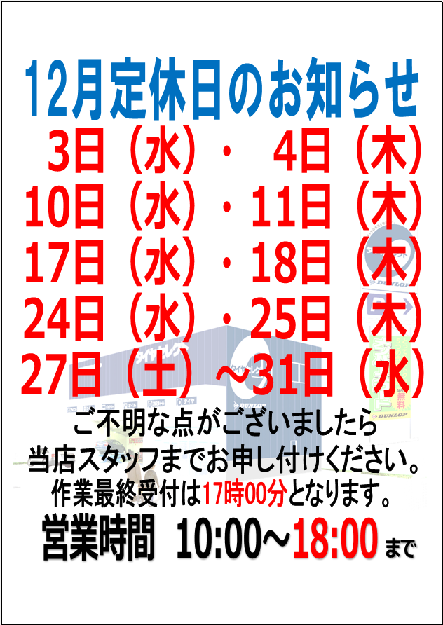 こんにちは、にしむらです。 12月の定休日のお知らせです。 『水曜日』と『木曜日』が定休日となりますので、ご注意お願いいたします。 また、12月27日(土)から来年1月4日(日)まで年末年始休業となります...