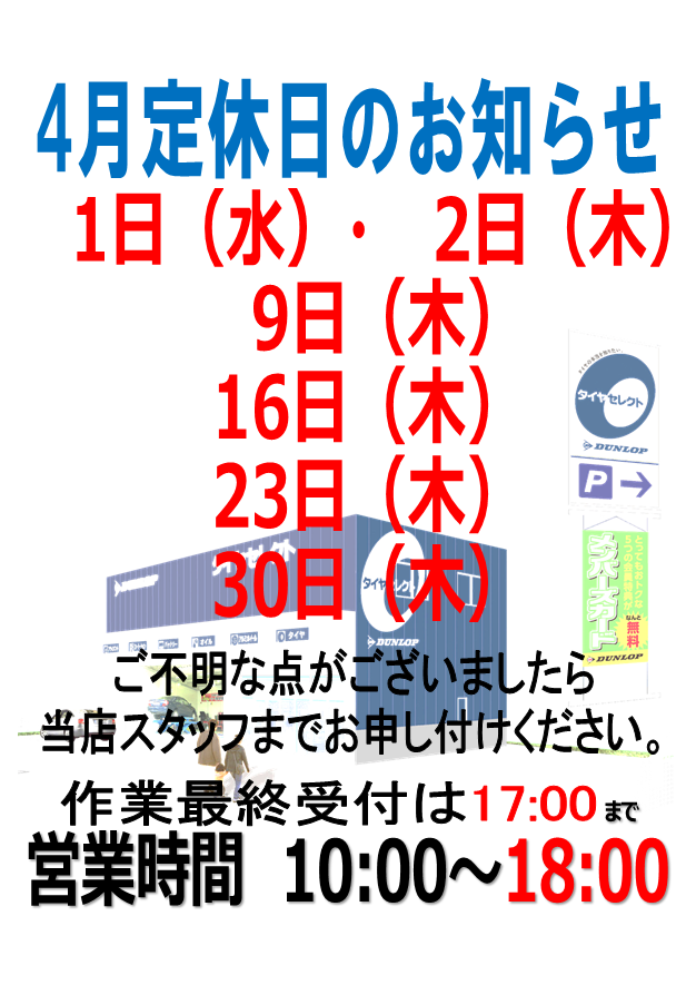 2026年4月 定休日のお知らせ