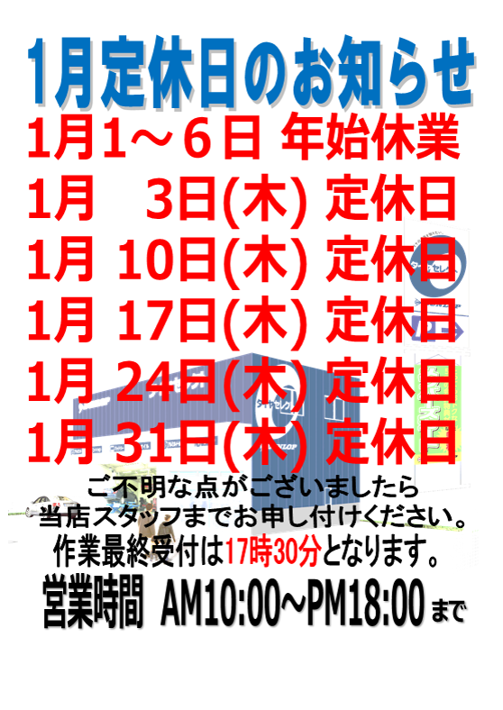 1月から営業時間が10:00~18:00(作業最終受付時間17:30)になります