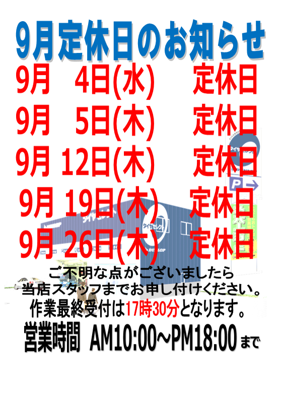 【タイヤ セレクト 千歳】 9月の定休日案内です★ 皆様、当店のホームページをご覧頂き誠にありがとうございます! 9月の定休日案内です 9月1週目は4日(水)、5日(木)と定休日となっておりますので、お間違いの無いようお願い致しますm(__)m 皆様の御来店心よりお待ちしております! 2019.08.30