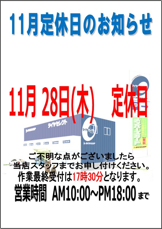 また11月の定休日は11/28(木)のみですのでお間違えの無いようお願い致します