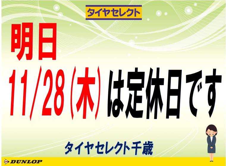 【タイヤ セレクト 千歳】 明日は定休日です! 皆様、当店のホームページをご覧頂き誠にありがとうございます! 明日11/28(木)は定休日とさせて頂きますm(__)m お間違いの無いよう宜しくお願い致します! 2019.11.27