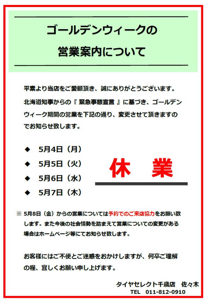 北海道知事からの「緊急事態宣言」に基づき、ゴールデンウィーク期間の営業を下記の通り変更致します。