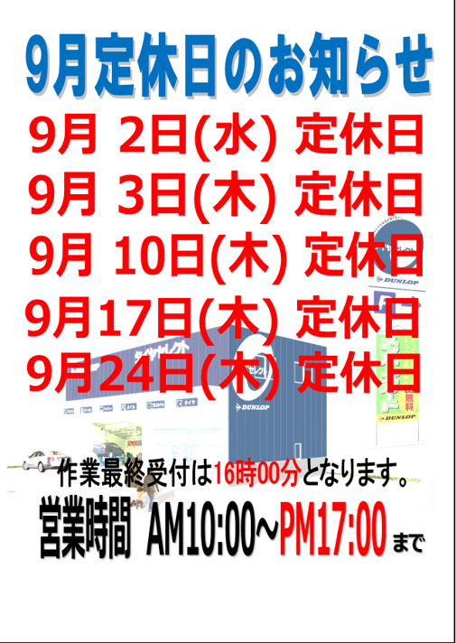 9月2日(水)・9月3日(木)は2日間定休日となっておりますので、お気を付けくださいませm(__)m