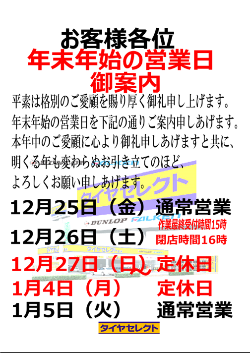 さて早速ですが、年末年始の営業日についてご案内致します。