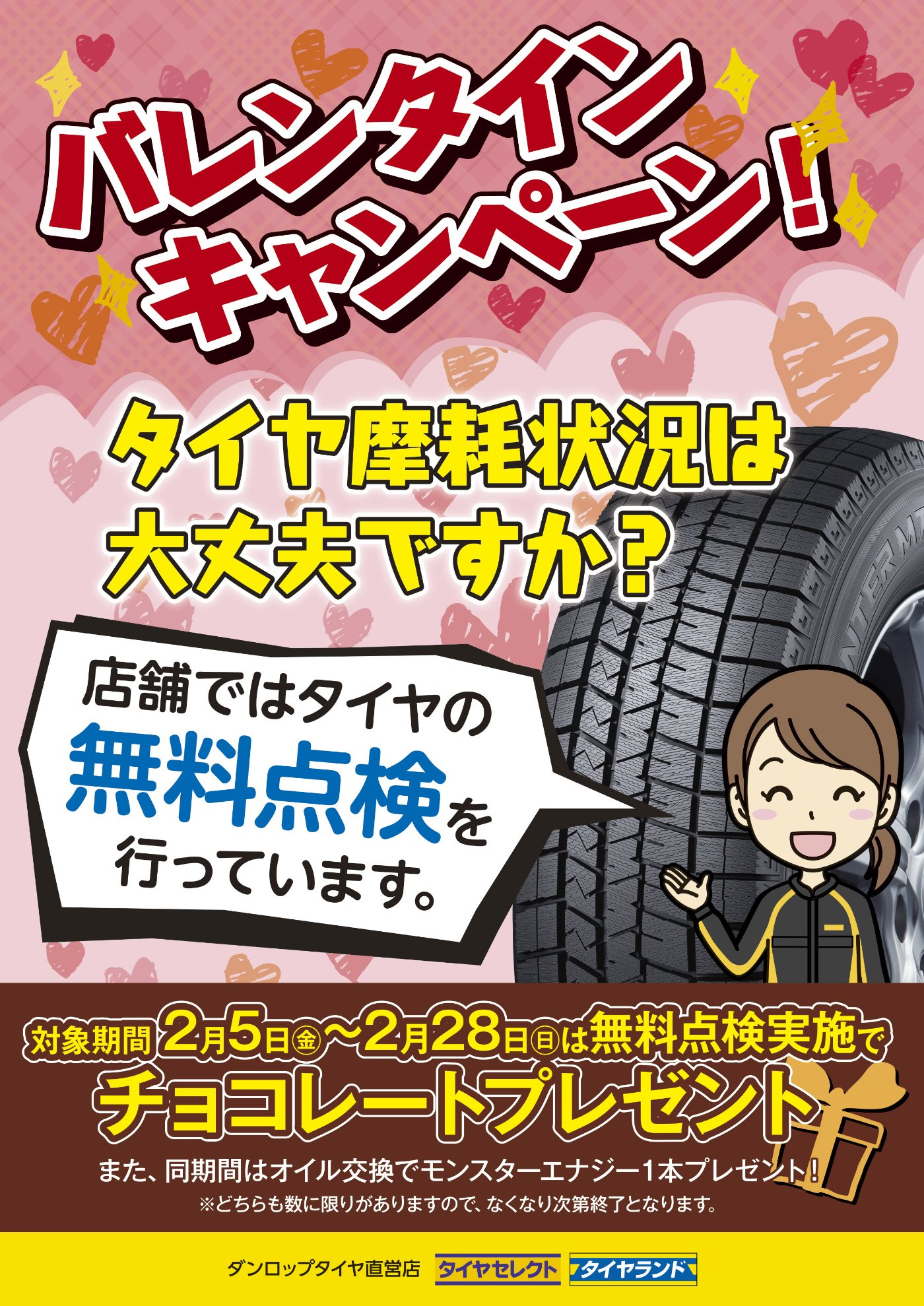期間2月5日(金)~2月28日(日)は無料点検実施で「チョコレートプレゼント」\(^_^)/