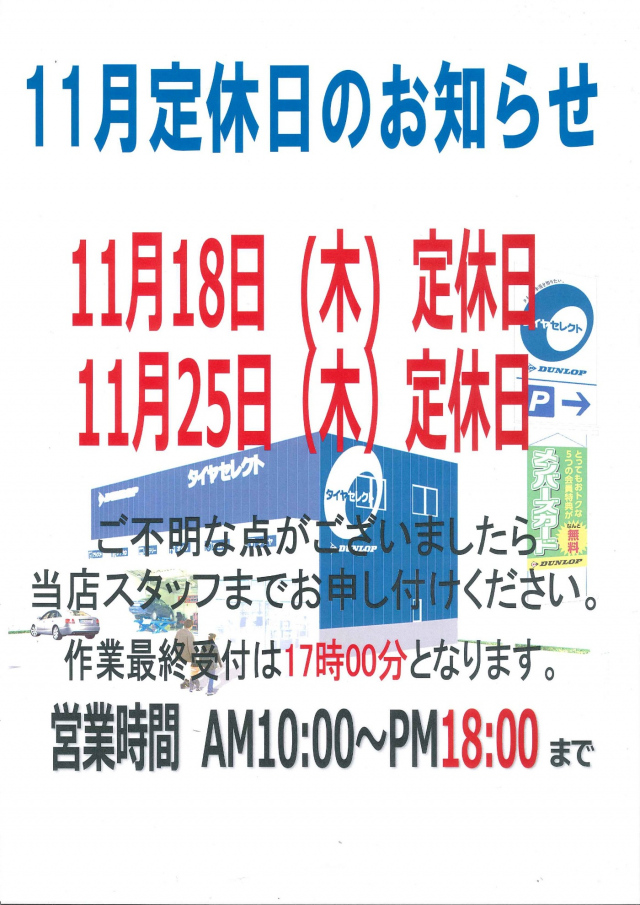 11月の定休日のご案内をさせて頂きます♪
