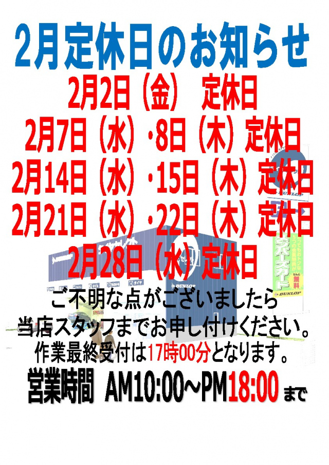 当店2月の定休日もご確認をお願い致します。 m(ーー)m