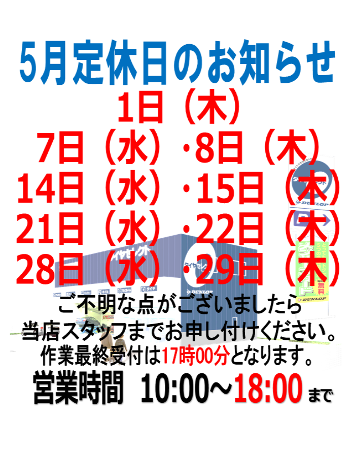 2週目以降から『水曜日』と『木曜日』が定休日となりますので、ご注意お願い致します。
