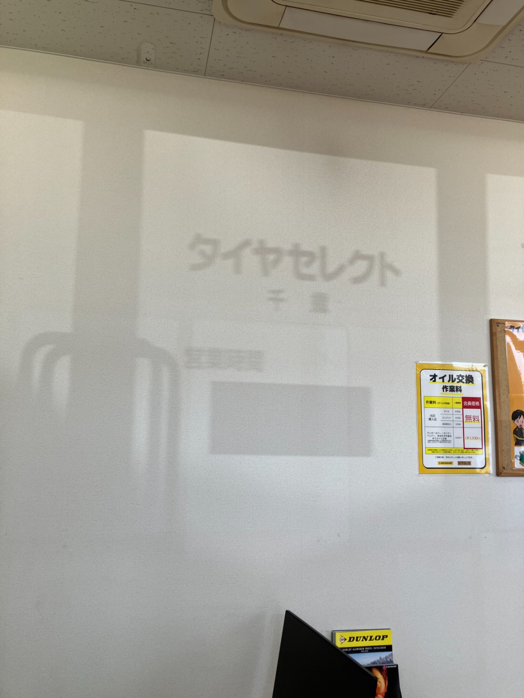 レジカウンター横の壁に映った『タイヤセレクト千歳』の文字。