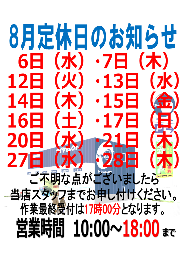 8月の定休日のお知らせです。