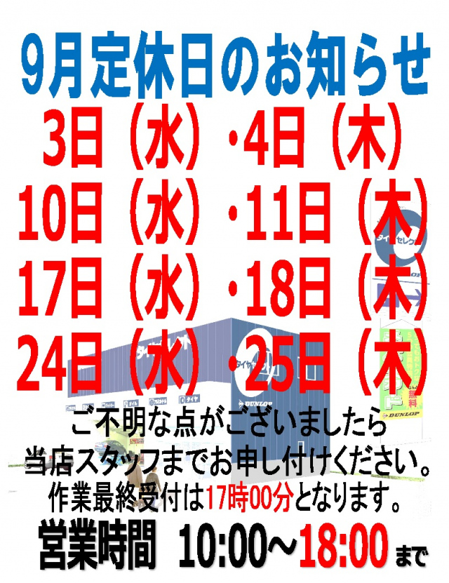 9月の定休日のお知らせです。