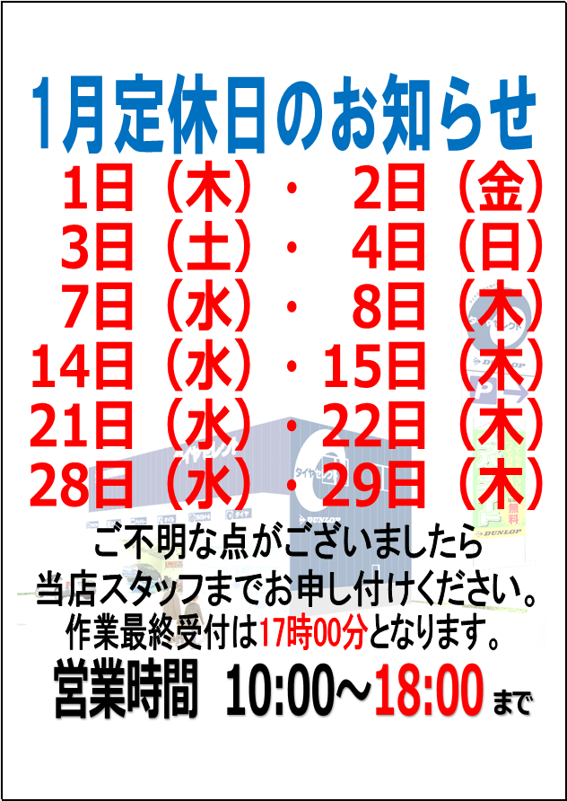 【12月26日】年末年始休業と1月定休日のお知らせ