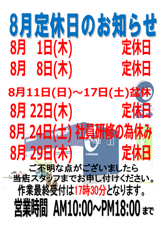 皆様、当店のホームページをご覧頂き誠にありがとうございます! 8月の定休日案内です 8月は休みが多くご迷惑をおかけしますm(__)m 明日は定休日ですのでお間違いの無いようお願い致し...