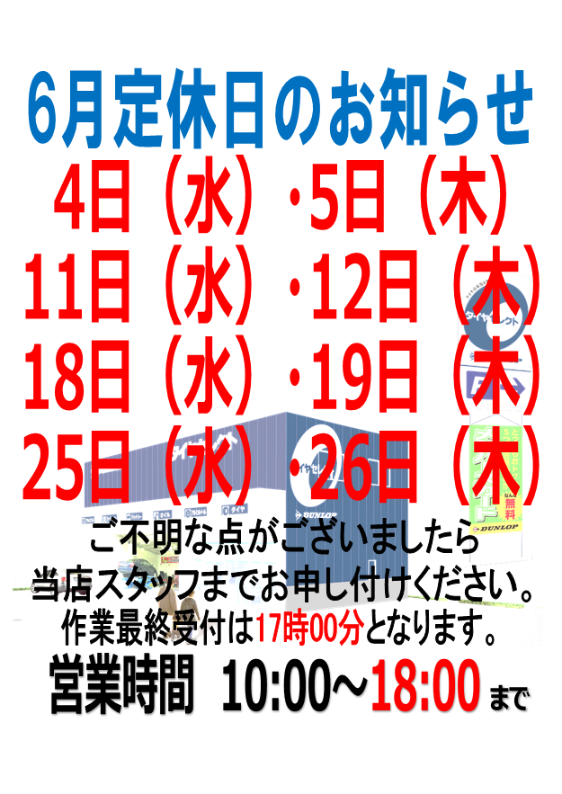 こんにちは、にしむらです。 6月の定休日のお知らせです。 『水曜日』と『木曜日』が定休日となりますので、ご注意お願いいたします。 ご不便をおかけいたしますが、よろしくお願いいたします。 ↓それではいつもの当...