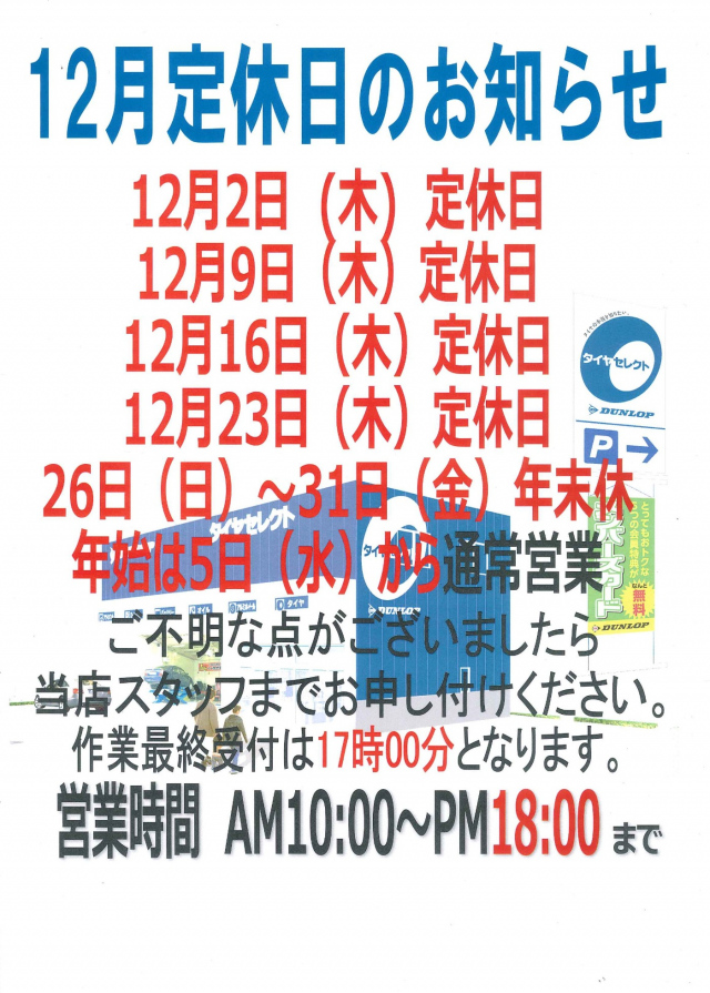 当店のホームページをご覧頂き誠にありがとうございます。 早いもので! 12月突入!今年も残すところ1カ月をきりました! では早速! 12月の定休日のご案内をさせて頂きます♪ 冬タイヤへの交換後の点検はお済ですか?...