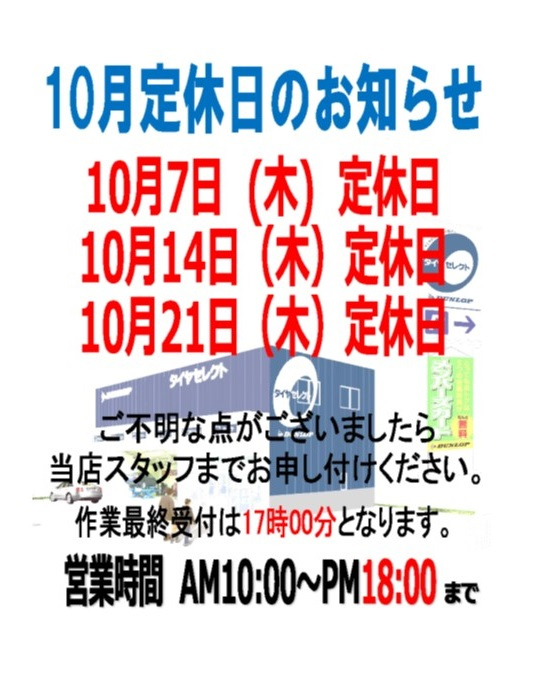 当店のホームページをご覧頂き誠にありがとうございます。 早いもので! 10月突入!今年も残すところ3カ月となりました! では早速! 10月の定休日のご案内をさせて頂きます♪ 冬タイヤのご準備お忘れではありませんか...