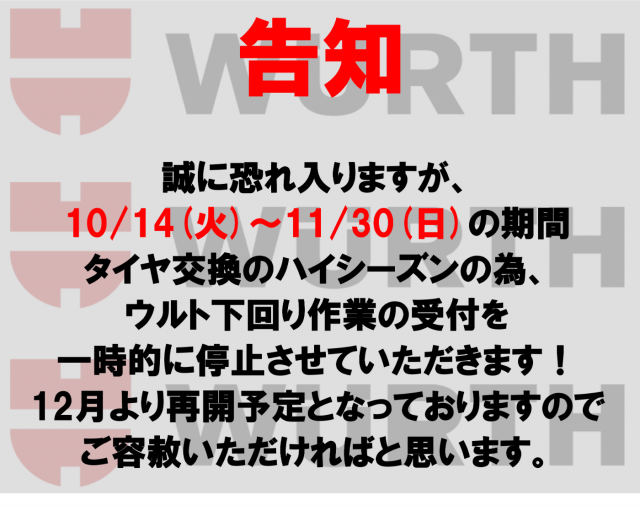 こんにちは、なかみちです。 本日はウルト下回り防錆施工の 一時受付停止のご案内をいたします。 当店では例年、10月中旬頃から冬タイヤへの交換作業が増加する傾向がありますので、 タイヤ交換作業が込み合う期間の ...