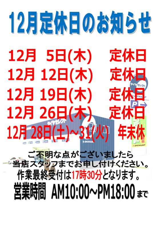 皆様、当店のホームページをご覧頂き誠にありがとうございます! 12月の定休日案内です お休みは以下の通りです! お間違いの無いよう宜しくお願い致しますm(__)m