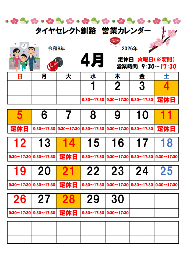 いつもタイヤセレクト釧路のホームページを ご閲覧いただきありがとうございます。 ☆春の早期予約 全力セール!☆ 開催‼ 期間:3月20日から3月31日まで ※タイヤセレクト釧路は定休日の都合上 3月23日~となりま...