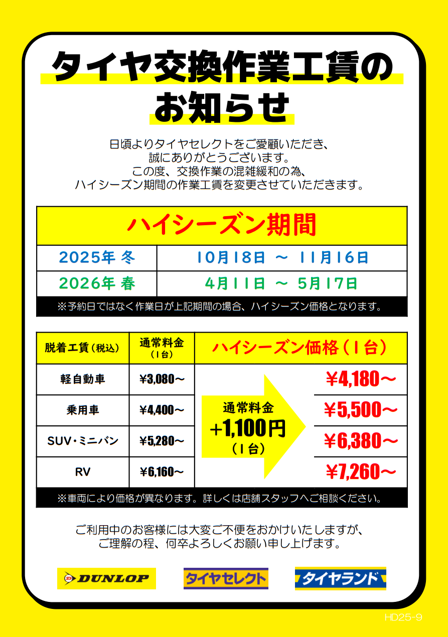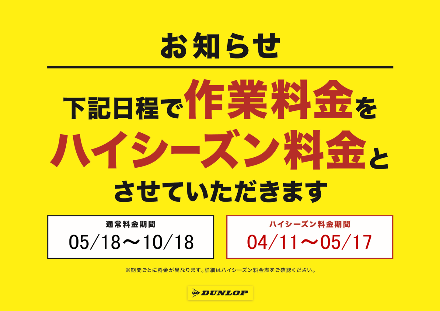 タイヤ交換作業が集中する時期の混雑緩和のため、下記期間中はハイシーズン価格にて作業工賃を設定させていただきます。