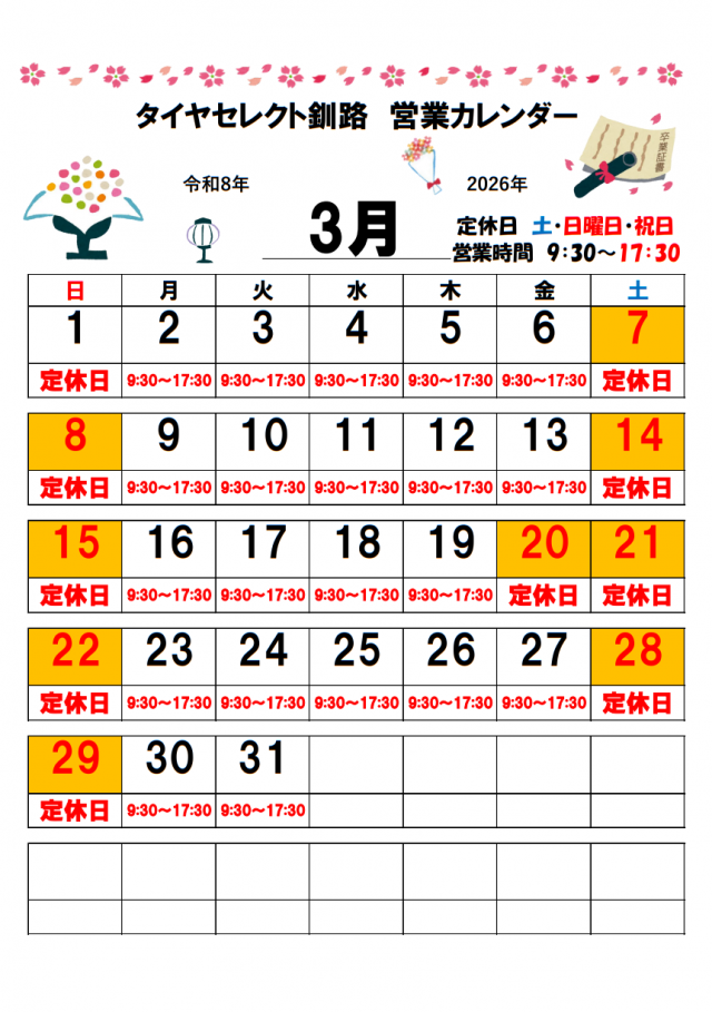 土・日・祝(4月・5月・10月・11月のタイヤ交換シーズンは※火曜のみ)一部の週末は定休日となっております。