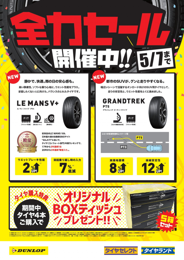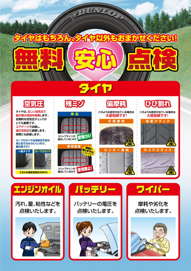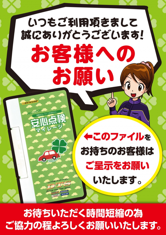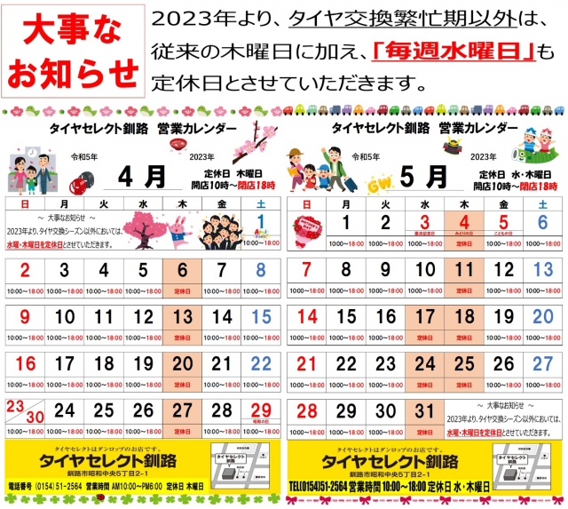 「タイヤセレクト釧路日記☆1956回目☆」~ coming soon... ~ お待ちください。 色々と。 ( '-' )ノ)`-' )ペシィィィッッッ! 鳴くまで待とうホトトギス。 どうも、紺田です。 本日もたくさんのご来店、 ありがとうございました。 タイヤ交換、新品タイヤのご購入、 アルミホイールのお買い上げも ありがとうございます! 装着画像を撮影させていただきましたが、 「お客様のお車紹介」コーナーへの掲載は 少々お待ちくださいませ。 よろしくお願いいたします。 ゴールデンウイーク中は、 5月4日木曜日のみ定休日 と、させていただき、 それ以外は通常営業しております。 ご来店、お待ちしております。 タイヤ交換作業予約。 一部日程は、ほぼ埋まってきていますが、 まだ空きのある日時もありますので、 ご希望の日程があるお客様は、 お早目のご予約をお願いします。 タイヤ交換作業は、 予約優先作業となりますので、 事前のご予約がお勧めです。 上記QRコードをスマホで読み込み、 Timyサイトから簡単に予約できます。 PCからは、 https://timy.jp/9709 こちらからどうぞ。 当店をご利用いただいている 会員様にお願いがございます。 会員カードの入ったマイレージファイル (上記の緑色のファイル)をお持ちの お客様は、受付時にご提示をお願いいたします。 受付時の時間短縮および、 以前の作業内容の確認のためにも ぜひよろしくお願いいたします。 ご使用中の夏タイヤ、状態はどうですか? 無料点検実施中です。 また、空気圧点検やナットの増し締めも 無料で実施中です。 スタッフまでお声掛けくださいませ。 タイヤ購入予定のお客様必見!! ただいま絶賛セール実施中です。 BOXティッシュも大量に用意してご来店を お待ちしております♪ もしもの時の安心。 「パンク安心保証プラン」 内容が新しくなっております。 詳細は店頭にてご案内いたします。 タイヤ購入時のご加入をお勧めいたします。 アンダーフロア防錆作業。 作業受付中です。 ※完全予約制となっておりますので、 事前に予約をお願いいたします。 また、タイヤ交換繁忙期は 一時的に作業受付を中止する場合が ございます。 タイヤ交換後の確認、されていますか?? タイヤ交換後、ナットの増し締めを推奨 しております。 目安としましては、タイヤ交換後 100km走行後です。 装着後、走行することで、なじみが発生し、 当たり面が変化することで、ナットの 締まり具合に変化が出る場合があります。 そのため、当店では増し締めを推奨しております。 もちろん、当店で作業したお車以外でもOK 点検は5~10分ほどで終わりますので、 お気軽にスタッフまでお声掛けくださいませ。 2023.05.03