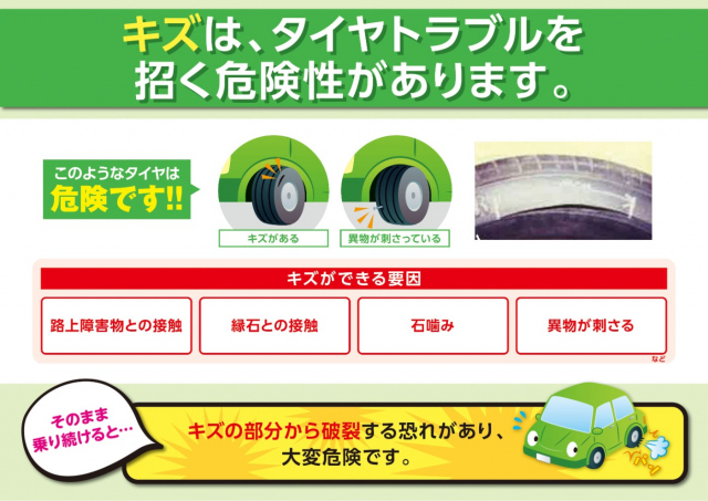 タイヤの残りミゾやキズ・ヒビ割れの確認、