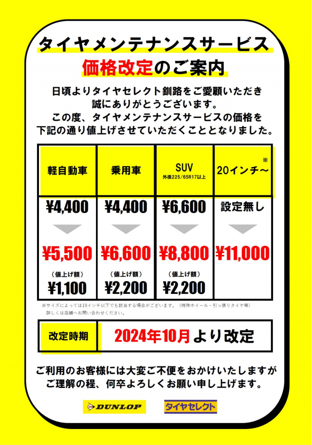 タイヤ交換シーズンは、火曜日のみ。(一部変更有)