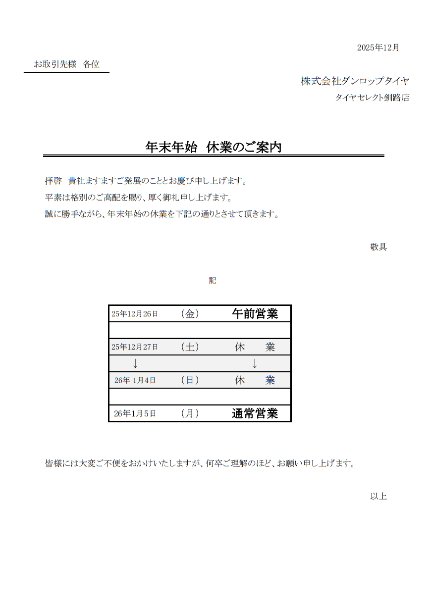 平素よりタイヤセレクト釧路店をご利用いただき、誠にありがとうございます。