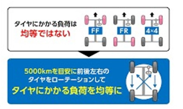 タイヤにかかる負荷で前後に差があるので、前後交換すること