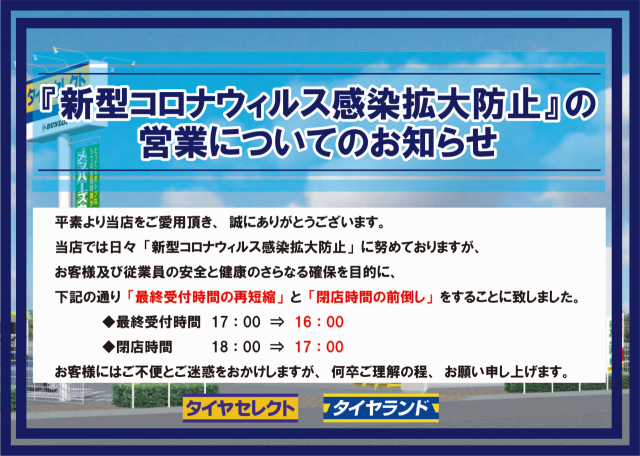 当店ではコロナウィルス感染拡大防止対策としてお客様及び従業員の安全と健康の確保の為、