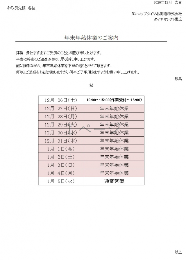 明日、26日の営業は15時までとなります。(作業受付は13時まで)