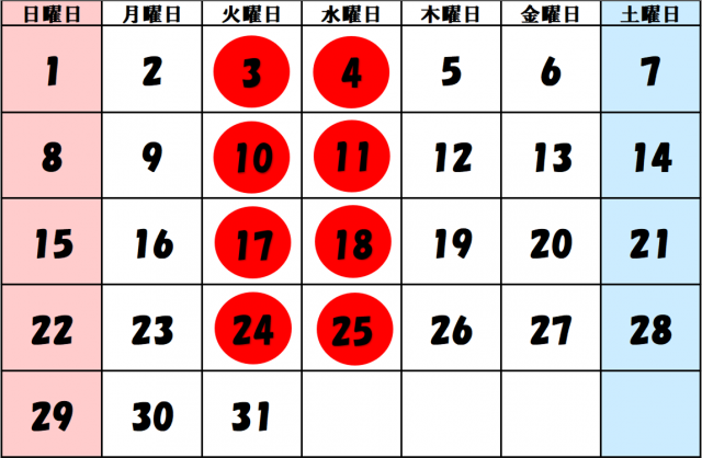 赤丸の日が定休日になります!