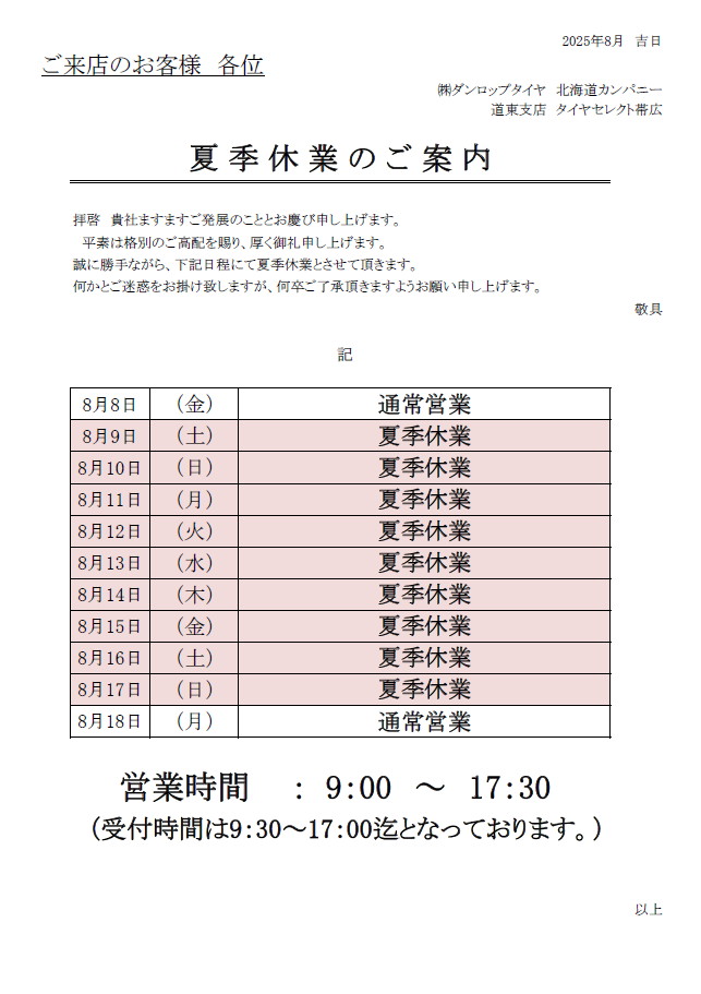夏季休業期間のご案内 当店では 8月9日(土) ~ 8月17日(日)の間 夏季休業期間となります。 前後の8月8日(金)・8月18日(月)は通常営業となります。 ご来店頂く皆様には ご不便ご迷惑をお掛け致しますが 何卒ご了承頂きますようお願い申し上げます。 2025.08.08