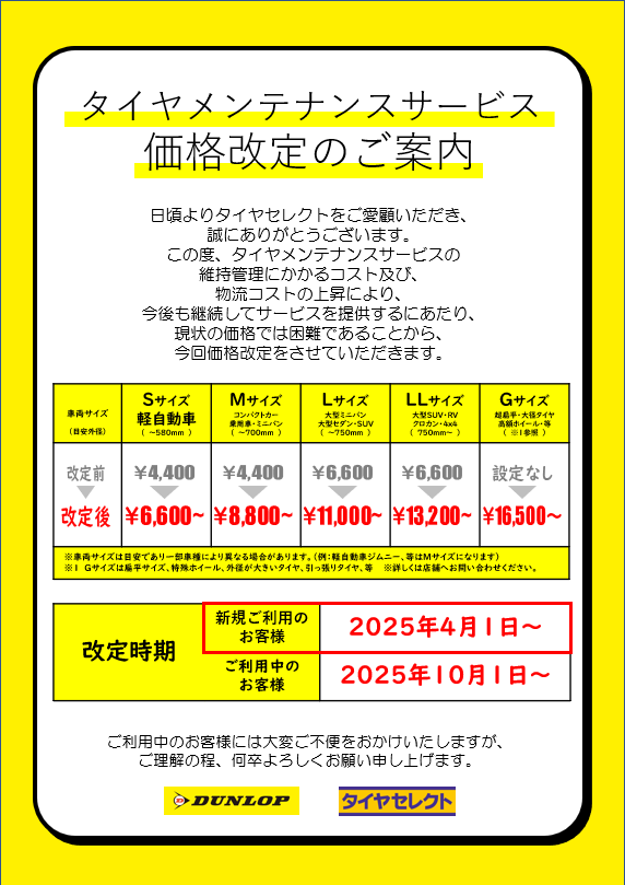 2025年より新規でタイヤメンテナンスをお申し込みされる方のご料金が変更となります。