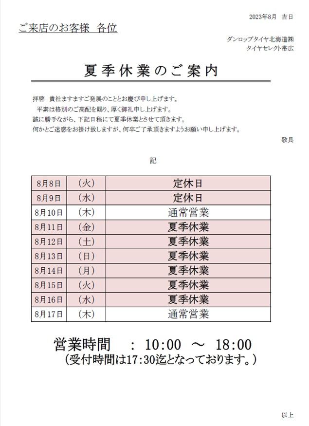 こんにちは 近藤です。 本日より、8月16日【水曜日】迄 誠に勝手ながら夏季休業とさせて頂きます。 何かお問い合わせ等ありましたら、 インスタグラムのDMもしくは、 Googleのメッセージよりお問い合わ...
