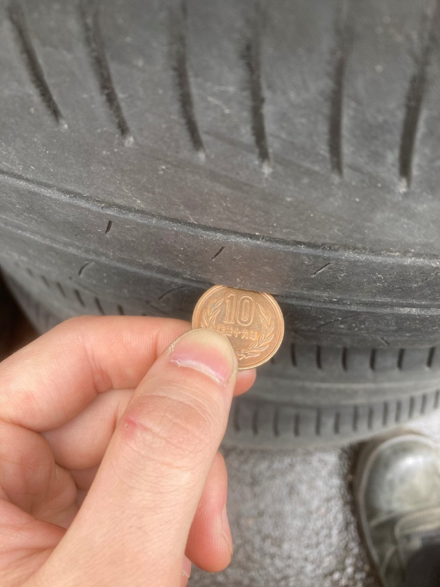 10円玉の10の方からタイヤの溝に差し込み、少しでも隠れていたら大丈夫です!