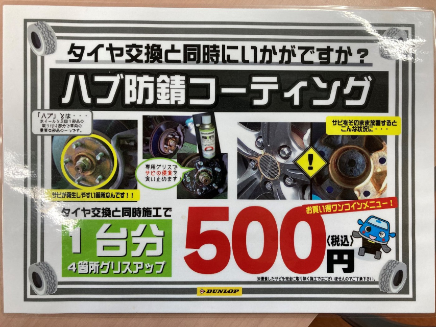 タイヤの取り付け面「ハブ」の錆を防ぐコーティングを1台500円で実施中!!