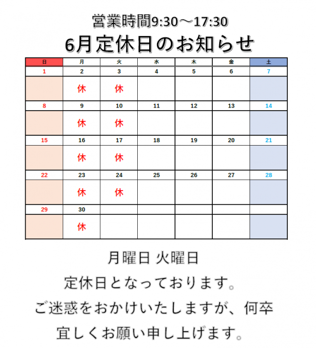 いつも当店をご利用いただきありがとうございます。 当店6月の定休日は以下画像の通りとなります