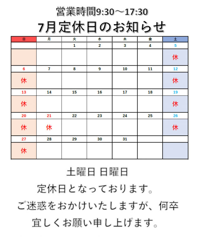 いつも当店をご利用いただきありがとうございます。 当店7月より定休日が変更となります。 以下画像の通りとなります。