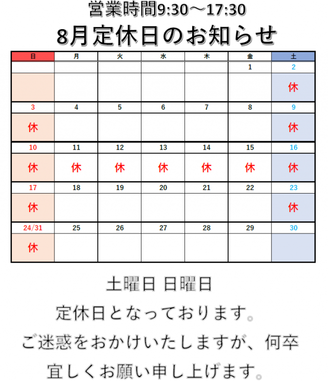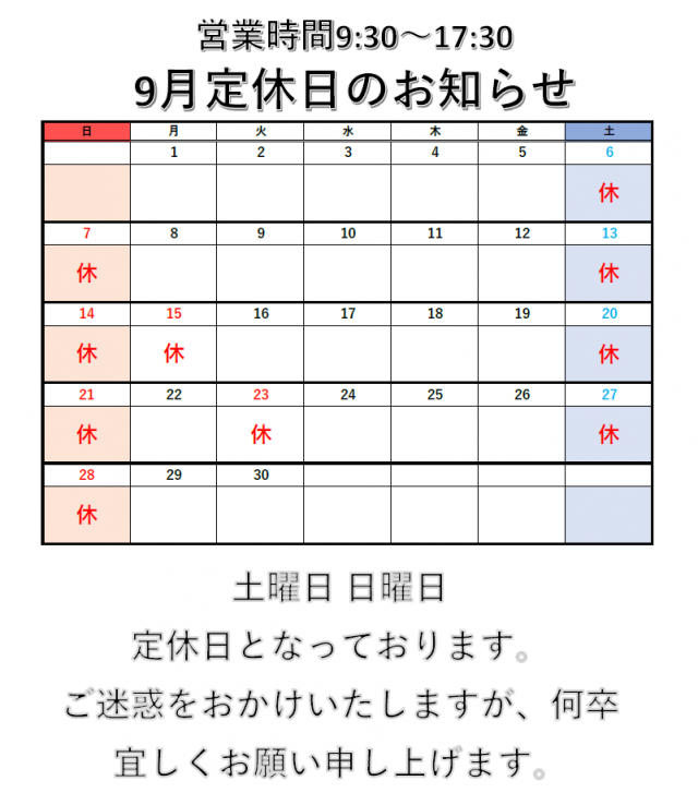 いつも当店をご利用いただきありがとうございます。 当店9月の定休日は以下画像の通りとなります