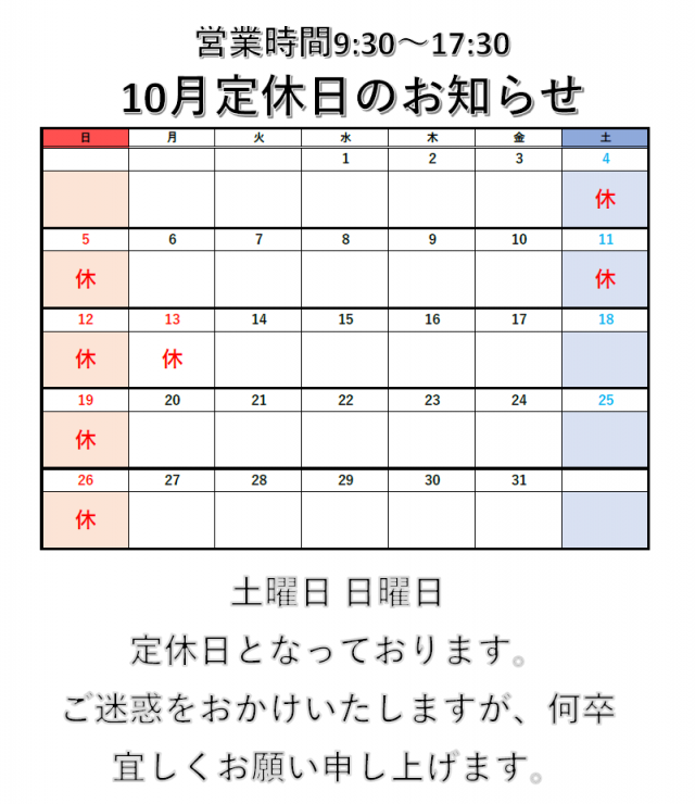 いつも当店をご利用いただきありがとうございます。 当店10月の定休日は以下画像の通りとなります